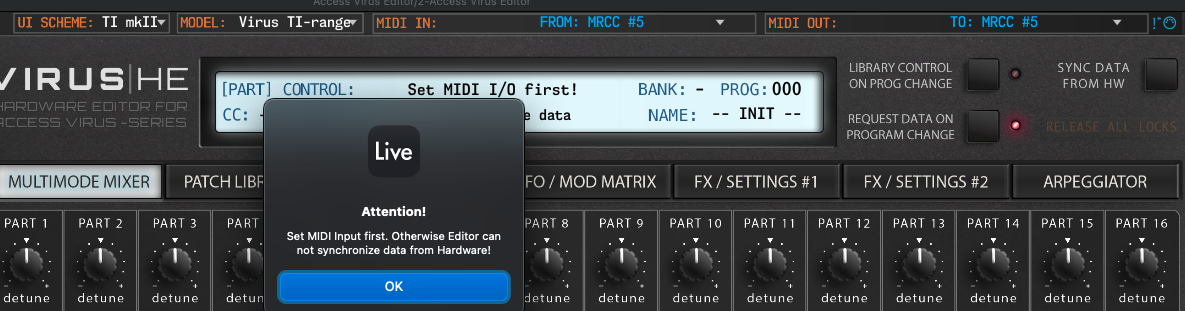 Hey! I can't seem to set up Aura plugins 1st editor for virus ti2 when midi goes via MRCC.